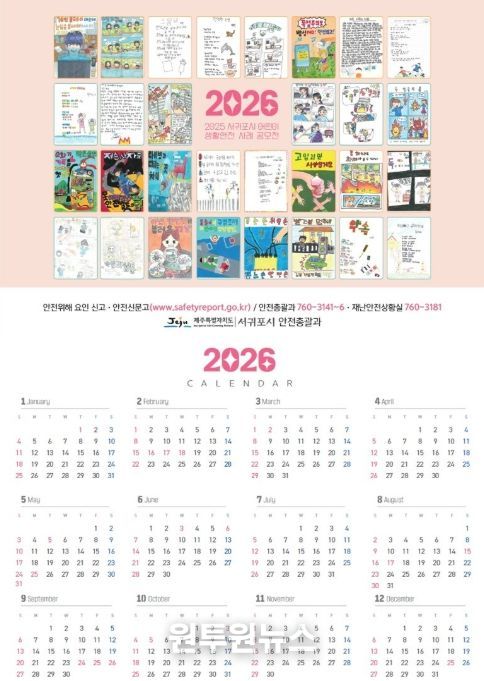 (원투원뉴스) 서귀포시는 지역사회에 생활 속 안전의식 확산을 위해 2025 어린이 생활안전사례 공모전 수상작 30작품을 활용한 안전문화달력 1,500부를 제작하여 전 부서와 학교, 유관기관에 배부했다고 밝혔다.