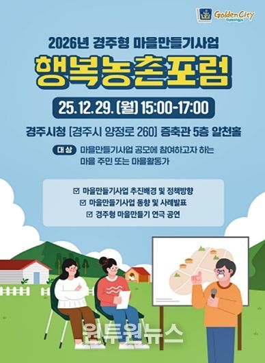(원투원뉴스) 경주시가 오는 29일 오후 3시부터 5시까지 청內 알천홀에서 주민·전문가·행정이 함께 참여하는 ‘경주시 마을만들기 행복농촌포럼’을 개최한다.