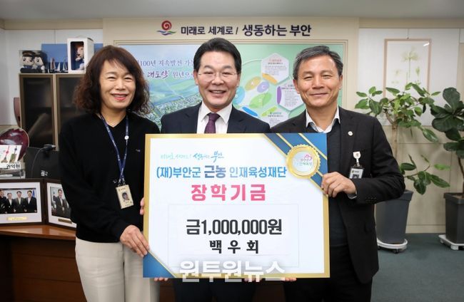 (원투원뉴스) 부안군 백산면 출신 공무원 모임인 백우회(회장 은진)는 22일 부안군근농인재육성재단을 방문해 지역인재 육성을 위한 장학금 100만 원을 기탁했다.