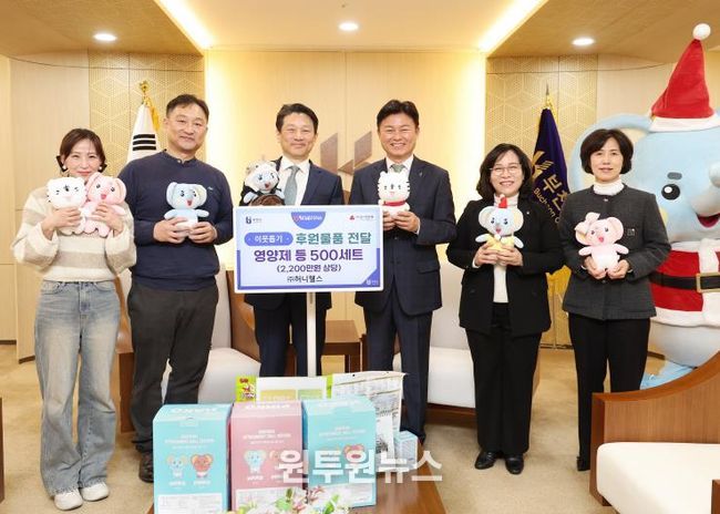 (원투원뉴스) 부천시는 지난 22일 ㈜허니웰스 대표 김원석으로부터 어린이 영양제, 비타민, 유산균 300세트와 어르신 영양제 200세트 등 모두 500세트, 총 2천2백만 원 상당을 기탁받았다.