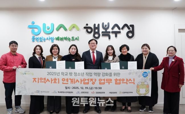 (원투원뉴스) 대구 수성구는 지난 19일 학교밖청소년의 직업 역량 강화를 위한 지역사회 연계사업 추진을 위해 관련 기관과 업무협약을 체결했다.
