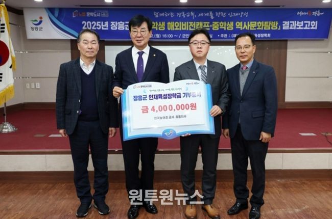 (원투원뉴스) (재)장흥군인재육성장학회는 22일 한국농어촌공사 장흥지사에서 장학금 4백만원을 기부했다고 밝혔다.