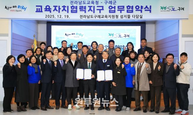 (원투원뉴스) 구례군은 지난 19일, 구례교육지원청 섬지뜰 다담실에서 전라남도교육청, 구례교육지원청, 구례군의회, 학교장, 민관산학위원, 학부모연합회 등 50여명이 참석한 가운데‘구례교육자치협력지구’업무협약을 체결했다고 밝혔다.