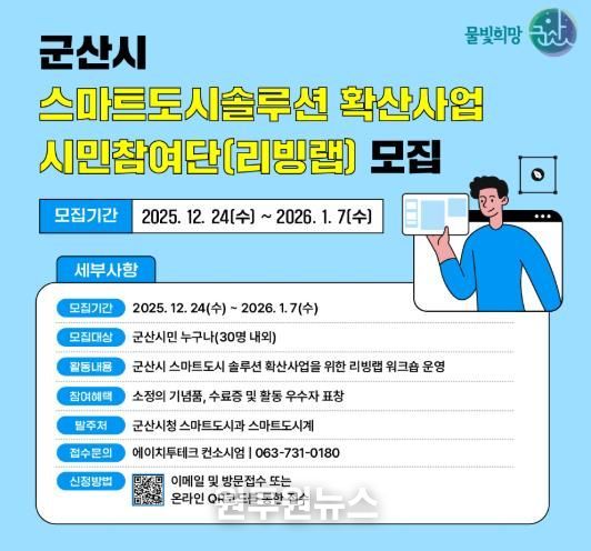 (원투원뉴스) 군산시가 국토교통부 주관 ‘스마트도시 솔루션 확산사업’ 추진의 하나로 시민이 직접 참여해 문제를 진단하고 개선방안을 도출하는 ‘스마트도시 솔루션 확산사업 리빙랩 시민참여단’을 2026년 1월 7일까지 모집한다.