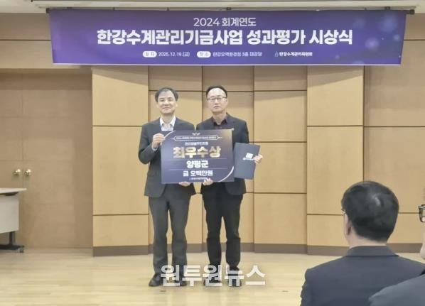 (원투원뉴스) 양평군은 지난 19일 한강유역환경청이 실시한 ‘2024년도 한강수계관리기금 성과평가’에서 주민지원사업 부문 최우수, 오염총량관리사업 부문 장려를 수상했다고 밝혔다.