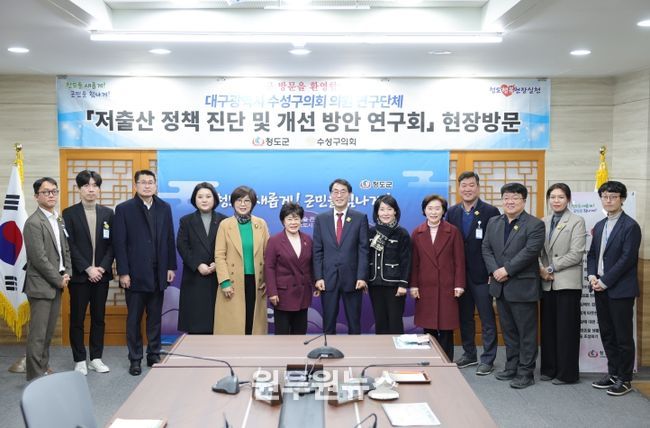 (원투원뉴스) 수성구의회 의원연구단체 '저출산 정책 진단 및 개선 방안 연구회'는 지난 22일 청도군을 방문해 체류형 생활인구 유입과 자생돌봄공동체 기반 저출산 대응 정책을 주제로 세미나 및 현장방문을 실시했다.