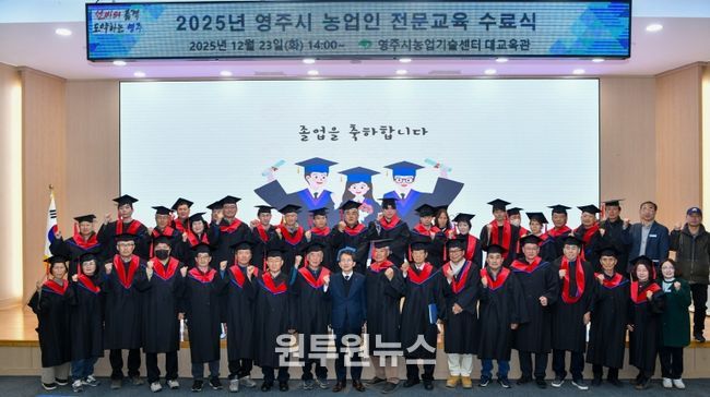 (원투원뉴스) 영주시는 지난 23일 농업기술센터 대교육관에서 '2025년 농업인 전문교육 수료식'을 열고, 1년간의 교육 과정을 마친 교육생 74명의 수료를 축하했다.