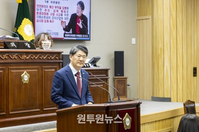 (원투원뉴스) 강서구의회 김희동 부위원장(미래복지위원회)은 지난 22일 제316회 강서구의회 제2차 정례회 본회의 5분 자유발언을 통해, 지난 9월 발생한 환경미화원 사망사고와 관련해 “관리·감독 의무를 방기한 행정이 빚어낸 명백한 인재”라며, 소관부서인 강서구청 자원순환과와 강서산업에 대한 전면 감사와 강력한 징계를 촉구했다.