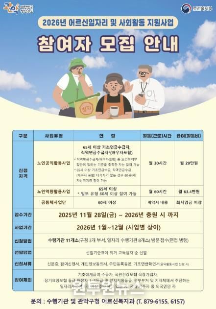 (원투원뉴스) 관악구가 초고령시대 진입을 앞두고 어르신들의 사회참여 증진과 노후 소득 보장을 위해 ‘2026년 노인일자리 및 사회활동 지원사업’을 대폭 확대 추진한다.