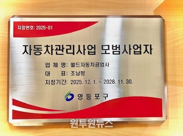 (원투원뉴스) 영등포구가 ‘자동차 관리사업 모범사업자’ 3곳을 신규 지정하고 인증 현판과 지정 증서를 전달했다고 밝혔다.