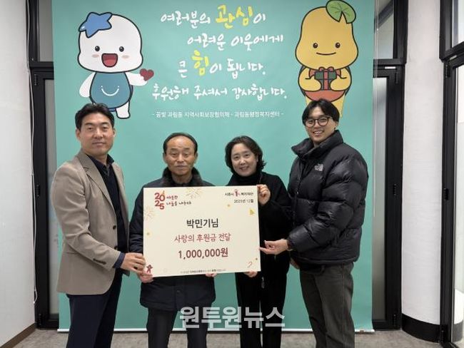 (원투원뉴스) 시흥시 과림동 행정복지센터는 지난 12월 16일부터 19일까지 주민 박민기 씨, 과림교회, 과림동 지역사회보장협의체 민자근 위원장으로부터 각각 100만 원씩의 후원금을 기탁받았다. 이들은 매년 어려운 이웃을 돕기 위해 후원금을 지속적으로 전달하며, 지역사회에 따뜻한 나눔을 이어가고 있다.