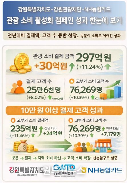 (원투원뉴스) 강원특별자치도와 강원관광재단은 NH농협카드와 함께 추진한 ‘강원 관광소비 활성화 상생 캠페인’ 결과, 전년 동일 기간 대비 관광 소비 금액과 결제 고객 수가 모두 증가하며 실질적인 지역 소비 활성화 성과를 거둔 것으로 나타났다.