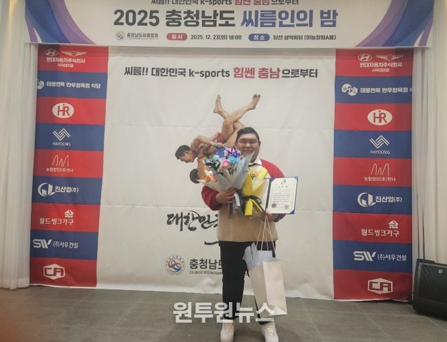 (원투원뉴스) 지난 23일 충남 당진시 A웨딩홀에서 열린 '2025년 충남 씨름인의 밤' 행사에서 청양초등학교 김민규(38) 씨름 감독이 충남교육감 표창을 수상하며 큰 주목을 받았다.