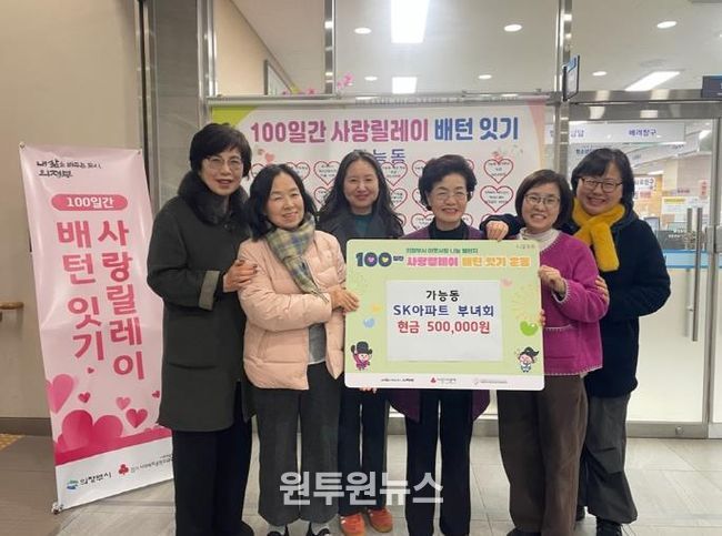 (원투원뉴스) 의정부시 가능동주민센터는 12월 22일 SK뷰아파트부녀회가 관내 저소득 가구를 돕기 위해 성금 50만 원을 기탁하며 ‘100일간 사랑릴레이 배턴 잇기’에 동참했다고 밝혔다.