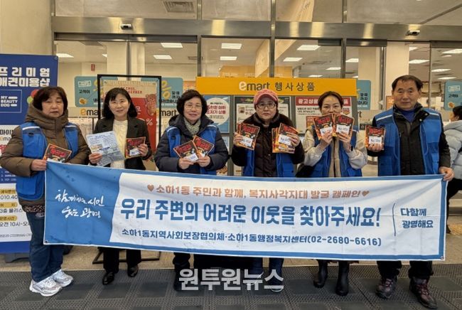 (원투원뉴스) 광명시 소하1동 지역사회보장협의체는 지난 23일 겨울철을 맞아 복지 사각지대에 놓인 위기가구를 발굴하고 지역 주민의 관심을 높이기 위해 소하동 상업지구에서 ‘복지 사각지대 발굴 캠페인’을 실시했다.