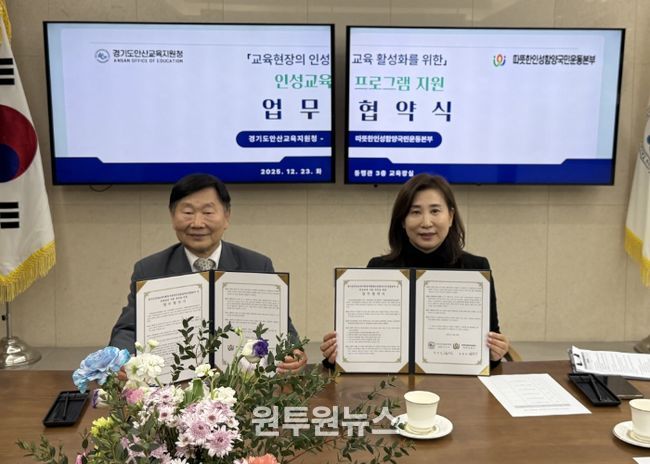 (원투원뉴스) 경기도안산교육지원청은 12월 23일 오후 3시 30분, 따뜻한인성함양국민운동본부와 학교 현장의 인성교육 강화와 도덕성 회복을 위한 지역 연계형 인성교육 지원 체계 구축을 위한 업무협약(MOU)을 체결했다.