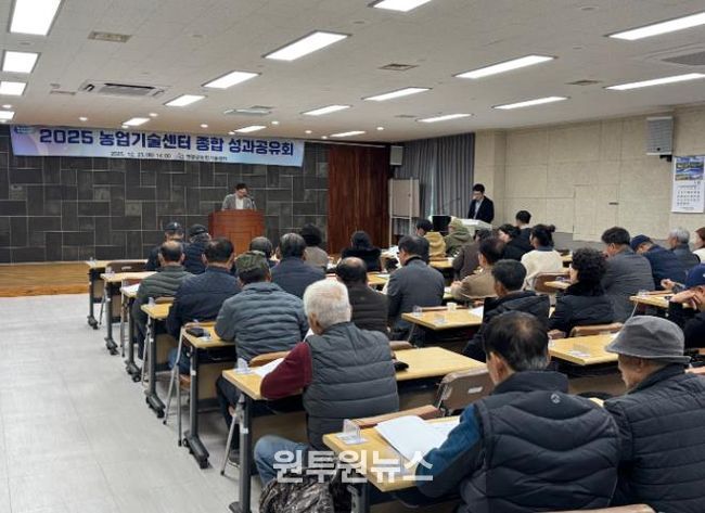 (원투원뉴스) 영광군은 12월 23일 영광군 농업기술센터 3층 대회의실에서 시범농가와 관계 공무원 등 70여명이 참석한 가운데 ‘2025년 농업기술센터 종합 성과공유회’를 개최했다.