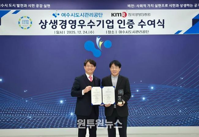 (원투원뉴스) 여수시도시관리공단은 상생경영 실천 성과를 인정받아 한국경영인증원으로부터 ‘상생경영 우수기업’ 인증을 2년 연속 획득했다고 24일 밝혔다.