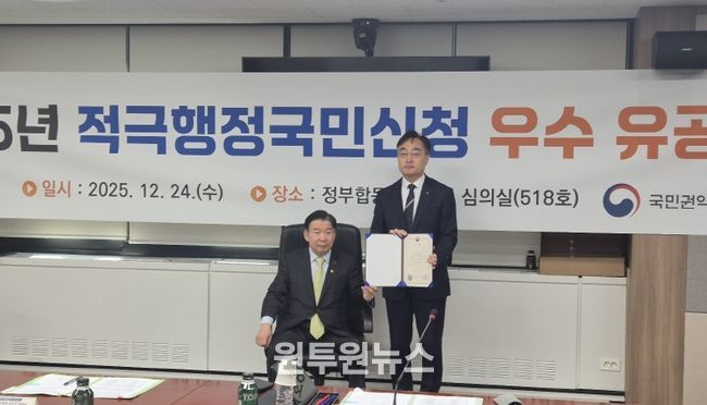 (원투원뉴스) 한국전력이 12월 24일 국민권익위원회가 주최한 ‘2025년도 적극행정국민신청 유공’ 시상식에서 ‘우수기관’ 및 ‘우수직원’ 2개 부문에서 국민권익위원장상을 수상했다.