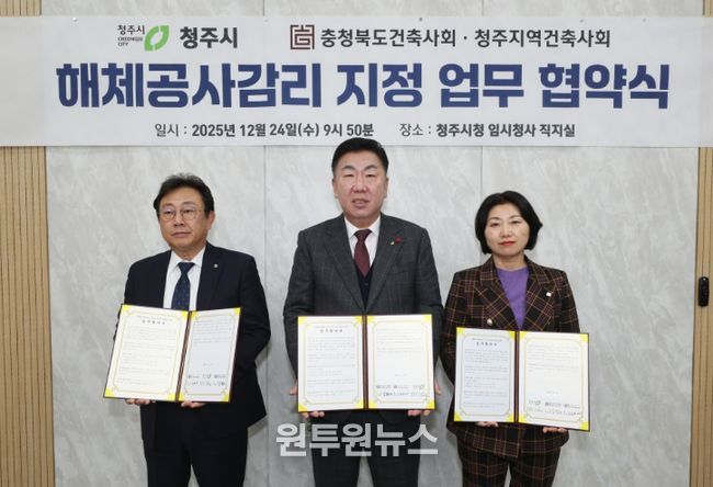 이범석 청주시장은 “이번 협약은 시민의 생명과 재산을 보호하기 위한 민관 협력의 모범 사례가 될 것”이라며 “앞으로도 건축사협회와 지속적으로 소통하며 안전한 도시 청주를 만드는 데 최선을 다하겠다”고 밝혔다.