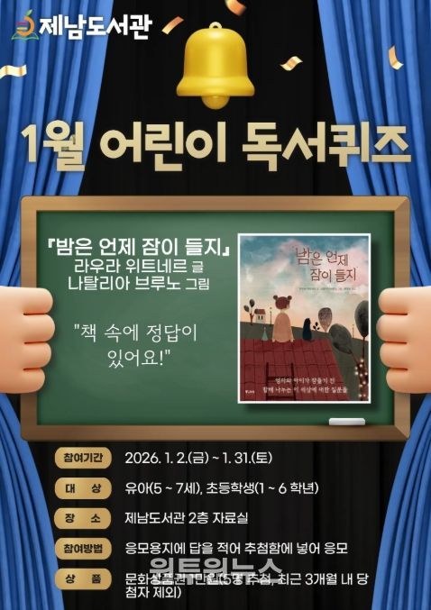 (원투원뉴스) 제주도교육청 제남도서관은 내년 1월 2일부터 6월 30일까지 자료실에서 어린이를 대상으로 책도 읽고, 문제도 풀어보는 ‘어린이 독서퀴즈’를 운영한다.