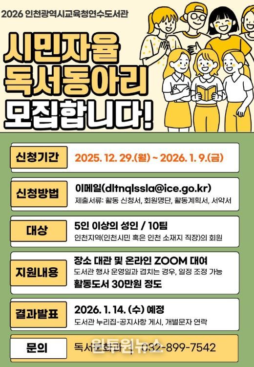 (원투원뉴스) 인천광역시교육청연수도서관은 시민의 자발적인 독서활동을 지원하고 독서생활화를 확산하기 위해 ‘2026년 시민자율독서동아리’를 모집한다.