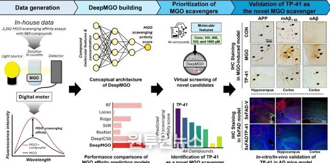 해당 모델을 활용한 AI 스크리닝으로 연구팀은 기존 트립토판 계열 물질보다 혈뇌장벽(BBB) 투과율이 우수한 신규 유도체 ‘TP-41’을 발굴하는 데 성공했다. TP-41은 MGO를 직접 소거하는 기전을 통해 독성을 낮추고, 뇌로의 전달 효율을 높인 것이 특징이다.