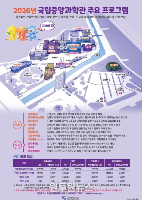 1월 말띠 해 기념 특별전과 우주·미래기술 관련 전시를 시작으로, 겨울방학 과학캠프, 해외 과학자 초빙 특강, 첨단기술 체험교실 등이 운영된다. 봄과 여름에는 사이언스데이, 어린이날 과학축제, 스포츠과학 행사, AI 해커톤 캠프, 공룡덕후박람회 등 온 가족이 함께 참여할 수 있는 대형 과학문화 행사가 이어진다.
