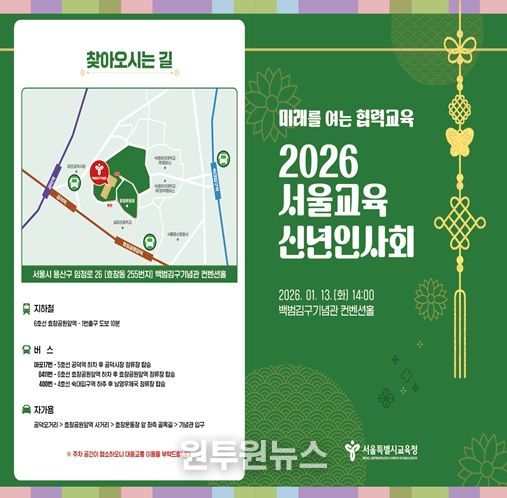 (원투원뉴스) 서울특별시교육청은 오는 1월 13일에 용산구 백범김구기념관 컨벤션홀에서 ‘2026년 서울교육 신년인사회’를 개최한다.
