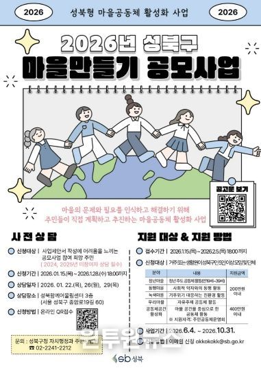 (원투원뉴스) 서울시 성북구는 마을공동체 활성화를 위해 '2026년 성북구 마을만들기 공모사업'을 진행한다.