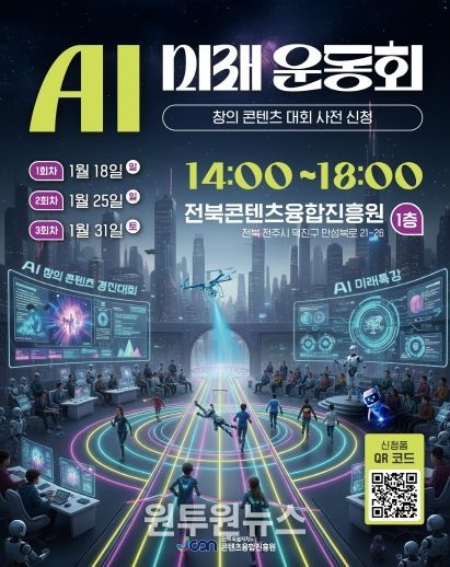 (원투원뉴스) 전북특별자치도가 주최하고 전북특별자치도콘텐츠융합진흥원이 주관하는‘AI 미래운동회 & 창의 콘텐츠 대회’가 오는 1월 18일, 25일, 31일 총 3회에 걸쳐 걸쳐 진흥원 1층에서 개최된다