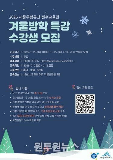 (원투원뉴스) 세종특별자치시가 오는 20일부터 27일까지 열흘간 ‘무형유산 전수교육관 겨울방학 특강’ 수강생 40명을 선착순 모집한다.
