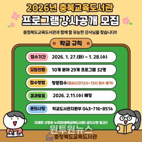 (원투원뉴스) 충청북도교육청 직속기관 교육도서관(관장 노재경)은 학생과 학부모, 지역주민에게 다양한 배움의 기회를 제공하기 위해 27일부터 28일까지 교육프로그램 강사를 공개 모집한다.
