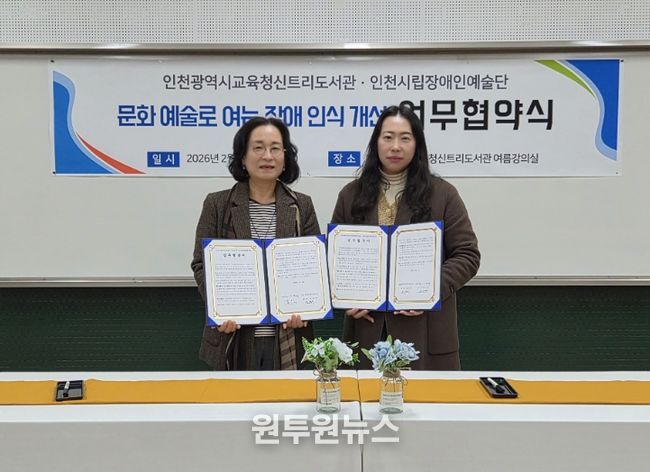 (원투원뉴스) 인천광역시교육청신트리도서관은 6일 인천시립장애인예술단과 ‘문화예술을 통한 장애 인식 개선 및 포용적 문화 확산을 위한 업무협약’을 체결했다.