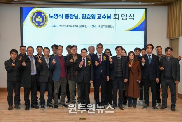 이날 퇴임식은 주요 약력 소개, 기념영상 상영, 감사패 및 꽃다발 증정, 퇴임사, 기념 촬영 순으로 진행됐다. 참석자들은 오랜 시간 대학과 지역을 위해 헌신해 온 두 사람의 명예로운 퇴임에 아낌없는 박수를 보냈다.