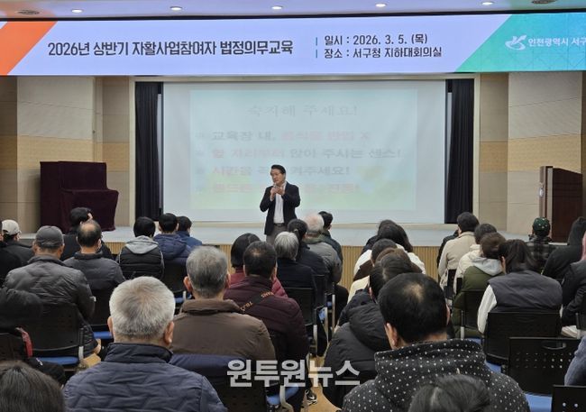 (원투원뉴스) 인천 서구는 지난 5일 자활사업 참여자 250여 명을 대상으로 ‘2026년 상반기 법정의무교육’을 실시했다고 밝혔다.