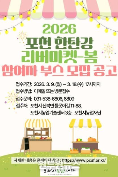 (원투원뉴스) 포천시농업재단은 오는 5월 한탄강 생태경관단지에서 열리는 ‘2026년 포천 한탄강 리버마켓-봄’ 행사에 참여할 부스 운영자를 공개 모집한다.