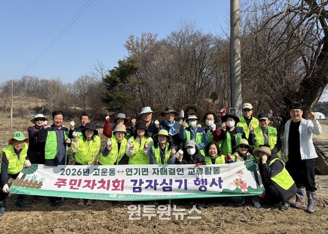 (원투원뉴스) 연기면 주민자치회와 고운동 주민자치회가 23일 오전 10시 연기면 눌왕리 일원에서 자매결연 교류활동의 일환으로 ‘행복나눔 감자심기 행사’를 진행했다.