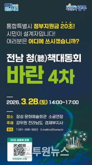 (원투원뉴스) 전라남도는 오는 28일 오후 2시부터 장성 문화예술회관에서 전남 청책대동회 바란을 개최, 전남광주통합특별시 출범과 함께 정부가 약속한 20조 원의 재정 활용 방안을 시도민과 함께 논의할 예정이다.