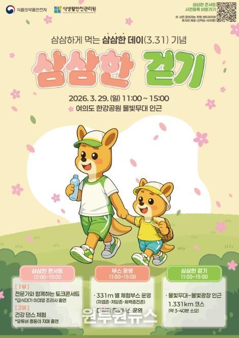 (원투원뉴스) 식품의약품안전처는 식약처 삼삼한 데이(3월 31일)를 맞아 3월 29일 여의도 한강공원에서 건강한 식습관 확산을 위한 ‘삼삼한 걷기’ 행사를 개최했다.
