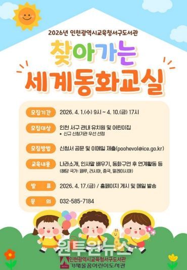 (원투원뉴스) 인천광역시교육청서구도서관은 4월 1일부터 10일까지 서구 관내 유치원 및 어린이집을 대상으로 ‘찾아가는 세계동화교실’ 참여기관을 모집한다.
