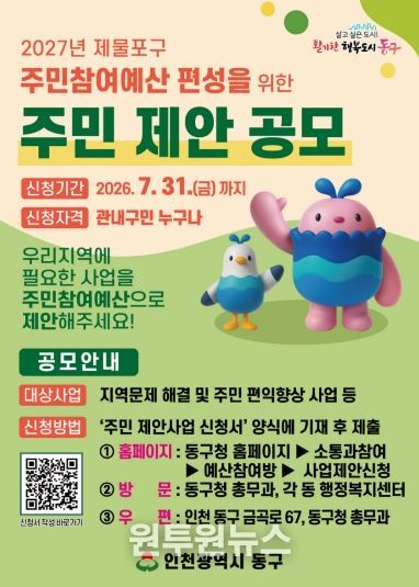 (원투원뉴스) 인천 동구는‘2027년 주민참여예산’제안 사업 공모를 오는 7월까지 진행한다고 밝혔다.