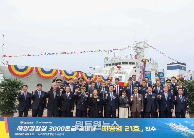 (원투원뉴스) 해양경찰청은 4월 1일, 울산광역시 동구에 소재한 HD현대중공업㈜에서 3000톤급 신형 경비함 태평양 21호(3021함)의 진수식을 개최했다.