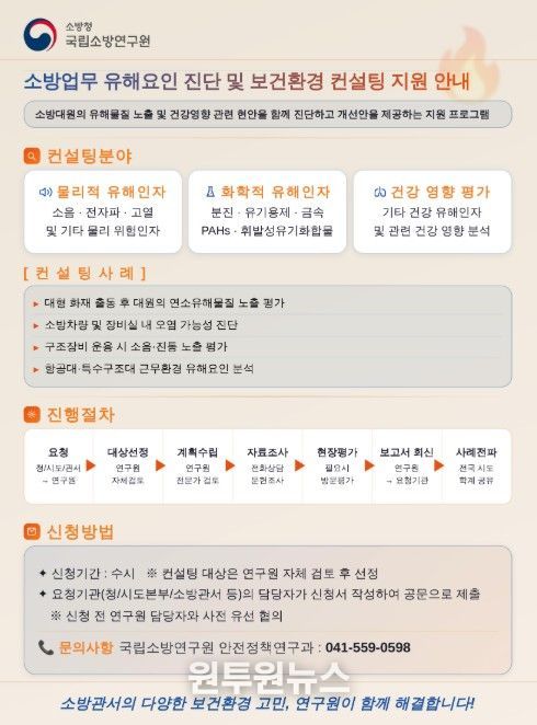 (원투원뉴스) 소방청 국립소방연구원은 소방공무원이 직무 수행 과정에서 노출될 수 있는 각종 유해 환경 요인에 대해 전문적으로 상담하고 개선 방안을 지원하는 ‘소방업무 보건환경 상담(컨설팅)’ 사업을 2026년부터 본격 운영한다고 밝혔다.