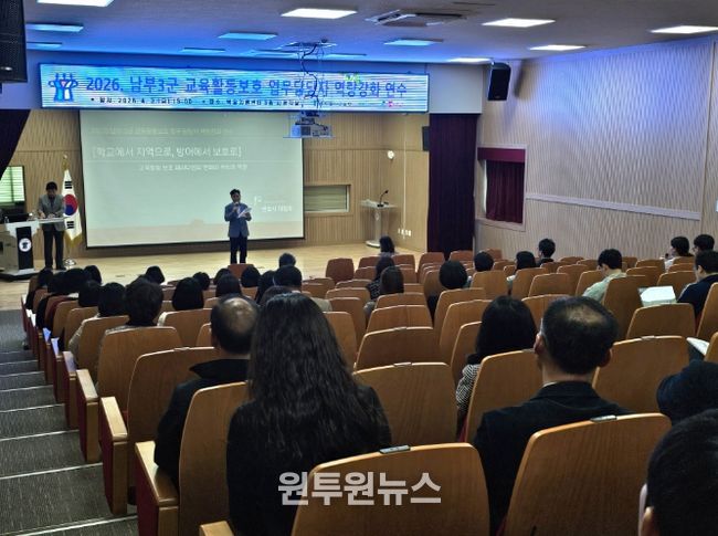 (원투원뉴스) 영동교육지원청은 3일, 학교지원센터 3층 시청각실에서 남부 3군(보은·옥천·영동) 소속 유·초·중·고등학교 교육활동 보호 업무 담당자 60명을 대상으로 ‘교육활동 보호 역량 강화 연수’를 개최했다.