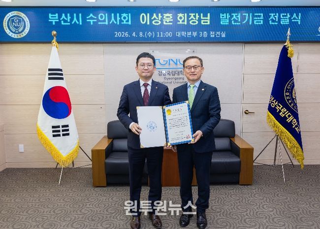 (원투원뉴스) 경상국립대학교는 4월 8일 오전 11시 대학본부 3층 접견실에서 이상훈 부산광역시 수의사회 회장(금빛동물수술센터 원장)의 대학발전기금 전달식을 개최했다.