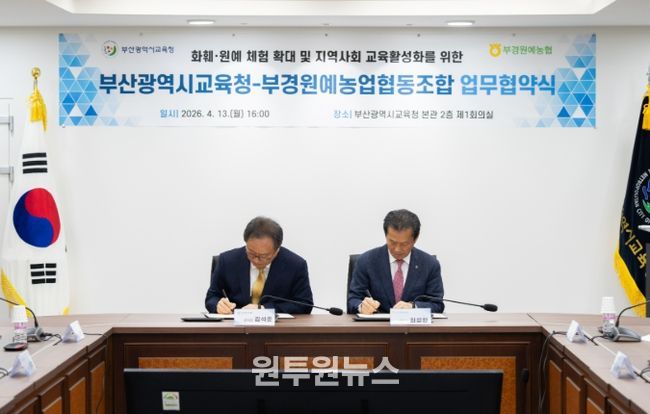 (원투원뉴스) 부산광역시교육청은 지난 13일 시교육청 제1회의실에서 부경원예농업협동조합(조합장 최성환)과 ‘지역사회 교육활성화를 위한 원예체험 프로그램 운영’ 업무 협약을 체결했다고 밝혔다.