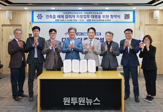 (원투원뉴스) 대전 유성구는 14일 구청 중회의실에서 대전광역시건축사회(회장 조한묵)와 건축물 해체 공사 감리자 선정 업무 대행을 위한 협약을 체결했다.