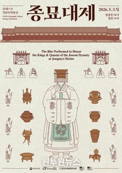 (원투원뉴스) 국가유산청은 산하 국가유산진흥원, 종묘대제봉행위원회와 5월 3일 오후 2시 종묘(서울 종로구)에서 '2026년 종묘대제'를 봉행한다.