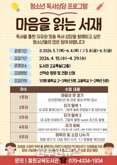 (원투원뉴스) 철원교육도서관(관장 김민서)은 5월 7일부터 6월 5일까지 2교육실에서 중·고생 10명을 대상으로 청소년 독서 상담·교육봉사 ‘나1너2(나읽너들)’ 프로그램을 운영한다.